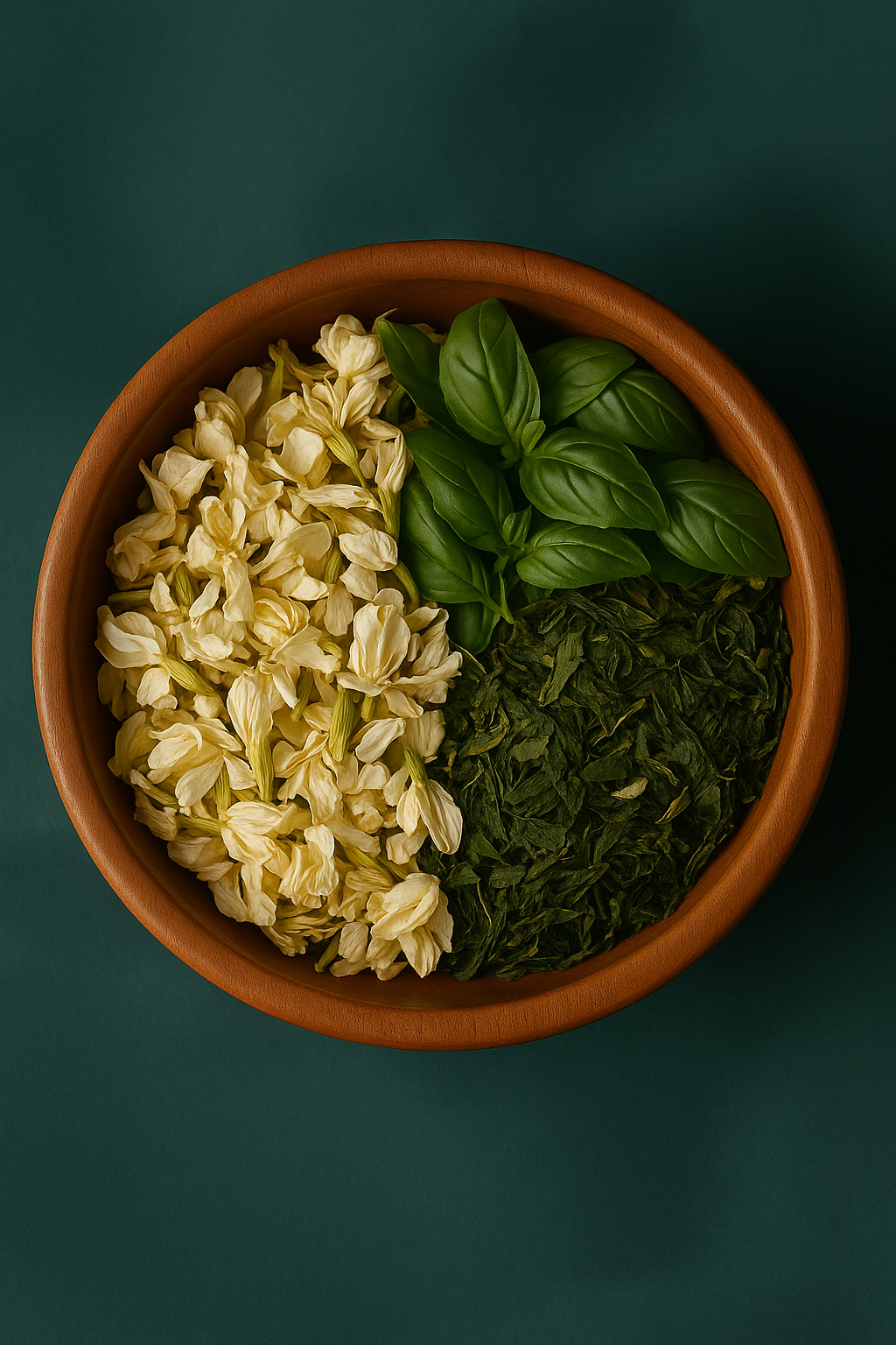 Known for its anti-inflammatory and antibacterial benefits, basil helps soothe scalp irritation and improve hair vitality over time.